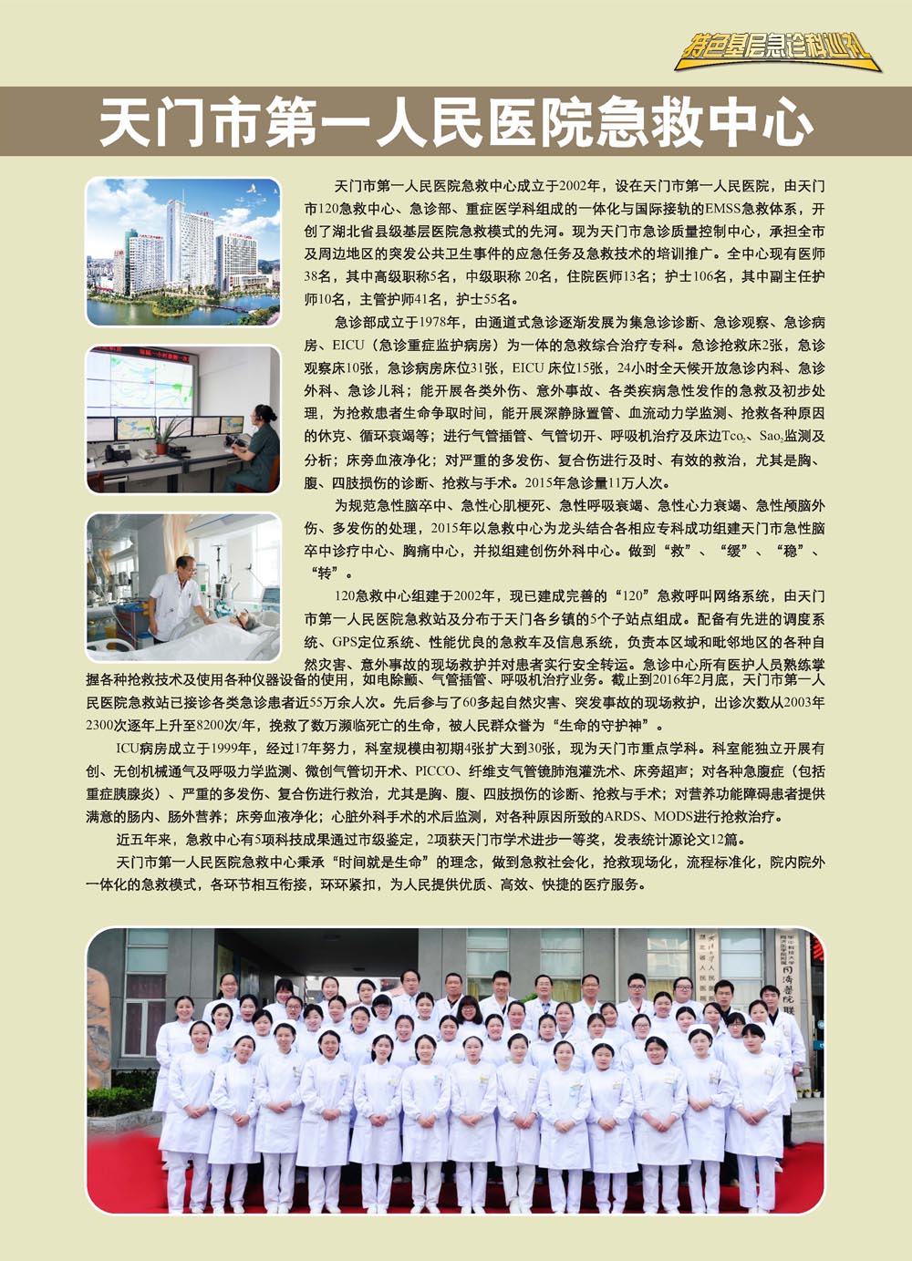 为规范急性脑卒中、急性心肌梗死、急性呼吸衰竭、急性心力衰竭、急性颅脑外伤、多发伤的处理,2015年以急救中心为龙头结合各相应专科成功组建天门市急性脑卒中诊疗中心、胸痛中心,并拟组建创伤外科中心。做到“救”、“缓”、“稳”、“转”。