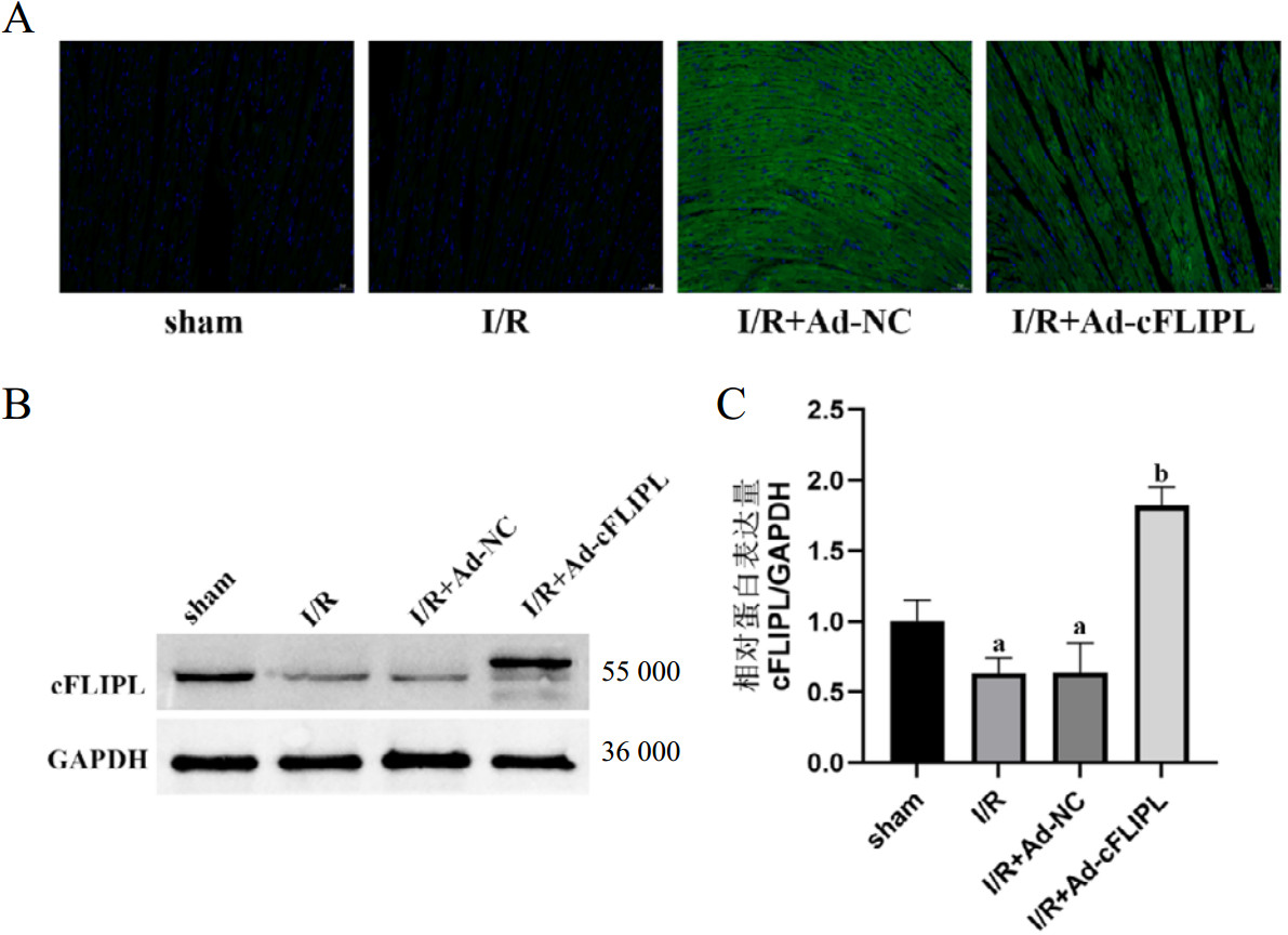 2 结果 2.1 成功感染重组腺病毒至大鼠心肌组织重组腺病毒cFLIPL注射至大鼠心肌组织3 d后,分别取各组大鼠心肌组织进行切片,置于荧光显微镜下观察,结果显示sham组与I/R组心肌组织无绿色荧光,而I/R+Ad-NC组和I/R+Ad-cFLIPL组心肌组织绿色荧光表达明显(图 1A)。进一步使用Western blot检测各组大鼠心肌细胞间cFLIPL的蛋白表达,发现与sham组相比,I/R组和I/R+Ad-NC组可显著下调cFLIPL的表达,而与I/R+Ad-NC组相比,I/R+Ad-cFLIPL组显著上调了cFLIPL的表达(图 1B、C)。以上结果提示重组腺病毒cFLIPL已成功感染至大鼠心肌组织。