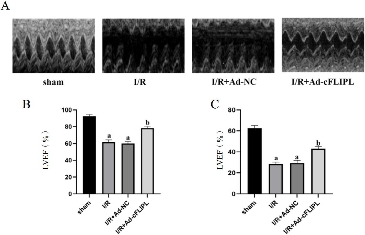 使用超声心动图评估I/R后大鼠心脏功能发现,与sham组相比,I/R组和I/R+Ad-NC组大鼠LVEF和LVFS值均显著降低(均P < 0.05),而与I/R+Ad-NC组相比,I/R+Ad-cFLIPL组LVEF和LVFS值均显著上升,差异具有统计学意义(图 2)。