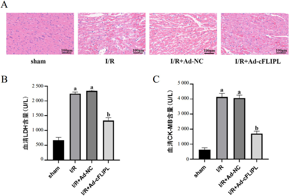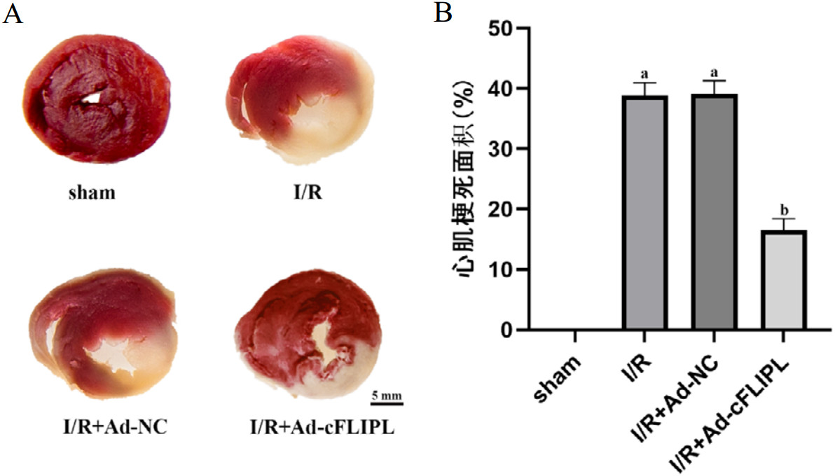 1.2 动物分组48只雄性无特定病原体级SD大鼠均在三峡大学实验动物中心购买,体重为180~200 g。所有动物实验根据“三峡大学实验动物护理和使用指南”进行,并经动物实验伦理委员会批准,批准号为2023060U。采用随机数字抽签法将SD大鼠随机分为以下4组:(1)假手术组(sham组):开胸后只穿线,不结扎冠状动脉左前降支(left anterior descending, LAD);(2)缺血-再灌注组(ischemia-reperfusion,I/R组):开胸后结扎LAD 30 min,再灌注3 h;(3) I/R+Ad-NC组:预先3 d感染Ad-NC后,开胸后结扎LAD 30 min,再灌注3 h;(4) I/R+Ad-cFLIPL组:预先3 d感染Ad-cFLIPL后,开胸后结扎LAD 30 min,再灌注3 h。