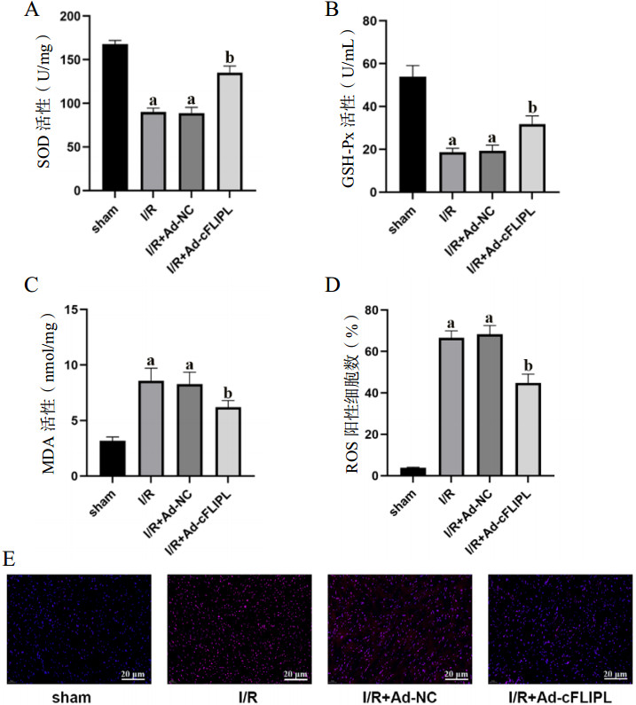 使用ELISA法检测氧化应激相关指标发现,与sham组相比,I/R组和I/R+Ad-NC组的SOD和GSH-Px活力显著降低,MDA浓度升高(均P < 0.05)。而与I/R+Ad-NC组相比,I/R+Ad-cFLIPL组SOD和GSH-Px活力显著升高,MDA浓度降低(均P < 0.05)(图 5A~C)。同时,使用DHE染色检测各组大鼠心肌组织ROS水平,与sham组相比,I/R组和I/R+Ad-NC组ROS阳性细胞比例显著增加(均P < 0.05),而与I/R+Ad-NC组相比,I/R+Ad-cFLIPL组ROS阳性细胞比例显著降低(P < 0.05)(图 5D、E)。