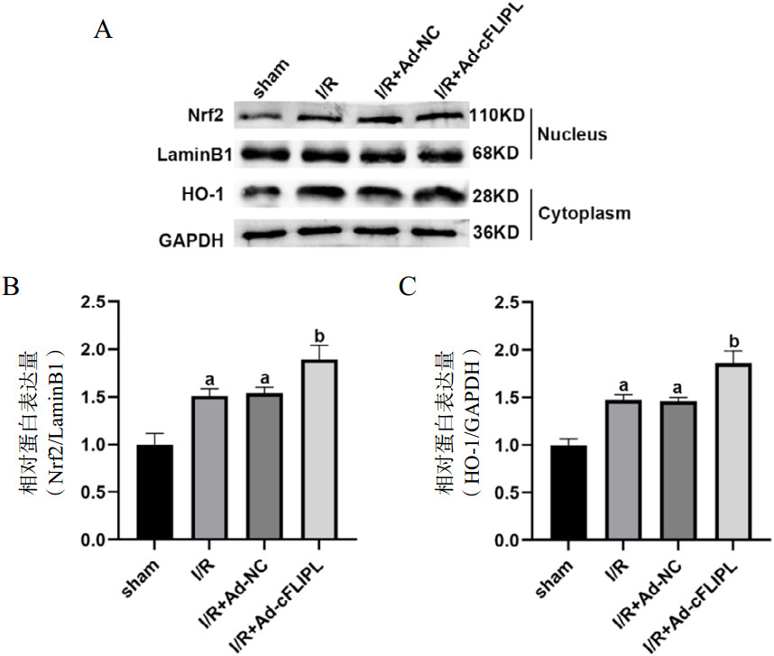 使用Western blot检测氧化应激相关蛋白的表达变化,与sham组相比,I/R组和I/R+Ad-NC组的p-Nrf2、Nrf2和HO-1蛋白表达显著增加(P < 0.05),且与I/R+Ad-NC组相比,I/R+Ad-cFLIPL组p-Nrf2、Nrf2和HO-1的蛋白表达进一步增加(P < 0.05)。见图 6。