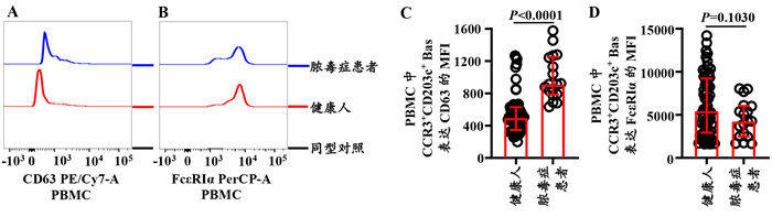 就PBMC中单个Bas CD63和FcεRIα表达的MFI而言,脓毒症患者CD63的MFI的表达水平较健康人增加了14.8%(Z=-5.351,P < 0.01;图 2A、C),而FcεRIα MFI表达水平虽然较健康人降低了22.3%,但差异无统计学意义(Z=-1.636,P=0.1030;图 2B、D)。