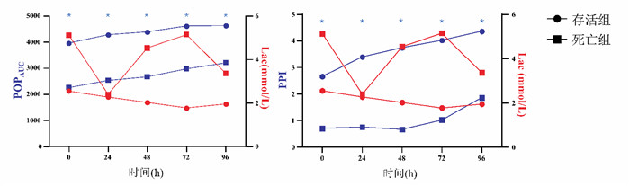 | 注:POPAUC: 脉搏血氧波形曲线下面积; PPI: 外周灌注指数; Lac: 乳酸 图 2 存活组与死亡组不同时间点POPAUC、PPI变化及与Lac比较 Fig 2 Changes in POPAUC and PPI at different time points and comparison with Lac between the survival group and the death group |