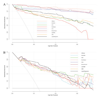 | 图 3 训练集(A)与验证集(B)的决策曲线分析(DCA) Fig 3 Decision Curve Analysis (DCA) of the training set (A) and the validation set (B) |
