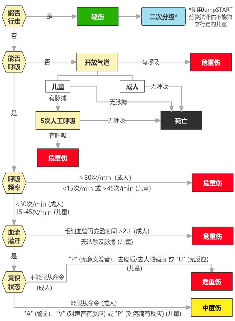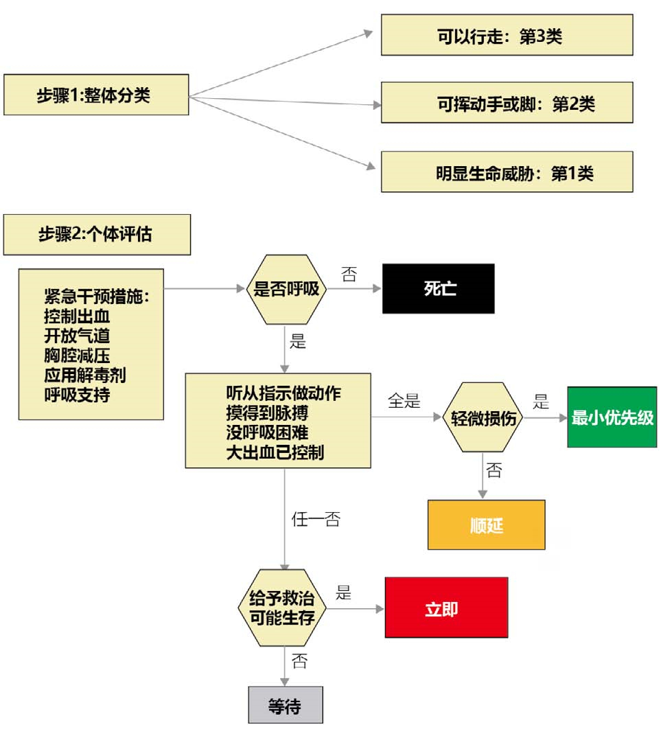 推荐意见6 现场救援应首先将伤员转移至安全区域,随后立即采用SALT检伤分类法或START/JumpSTART检伤分类法进行划分,并优先为红色标识的重伤员提供维持生命体征的基础急救,为后续转运争取时间。(推荐强度评分:4.76分)