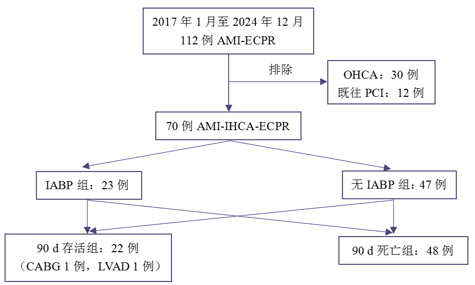 1 资料与方法 1.1 研究对象收治于本中心的实施ECPR患者。启动指征: ①可逆性病因; ②年龄 < 80岁; ③有目击的CA; ④CA到启动ECPR的时间 < 30 min; ⑤基础疾病非终末状态[5]。2017年1月至2024年12月共有连续112例AMI导致CA的患者接受ECPR, 排除30例OHCA和12例既往接受PCI治疗的ECPR患者, 共纳入70例AMI-IHCA-ECPR患者为研究对象。所有患者均遵照成人ECPR实践路径系统化管理[6], 出现临床左心室扩张(left ventricular distention, LVD)的患者, 联合主动脉内球囊反搏(intra-aortic balloon pump, IABP)以左心减负[7]。本研究已获得南京医科大学第一附属医院伦理委员会批准(伦审号: 2019-NT-12)。患者纳入分组流程见图 1。