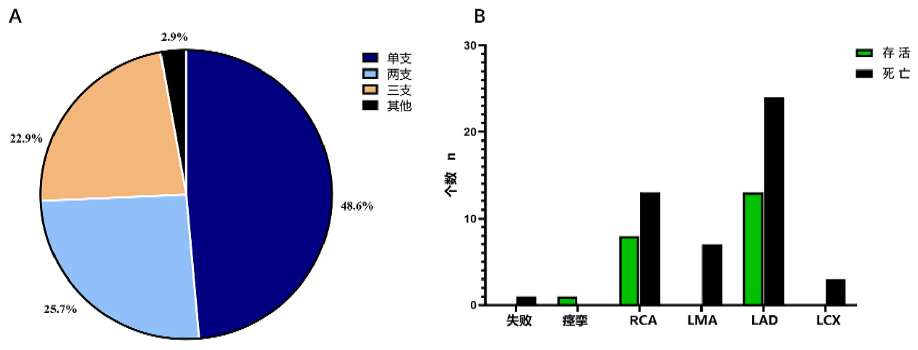 | 图 2 AMI-IHCA-ECPR患者的冠状动脉病变特征(A)和罪犯血管分布(B)(n=70) Fig 2 Characteristics of coronary artery lesions (A) and distribution of offender blood vessels (B) in AMI-IHCA-ECPR patients (n=70) |