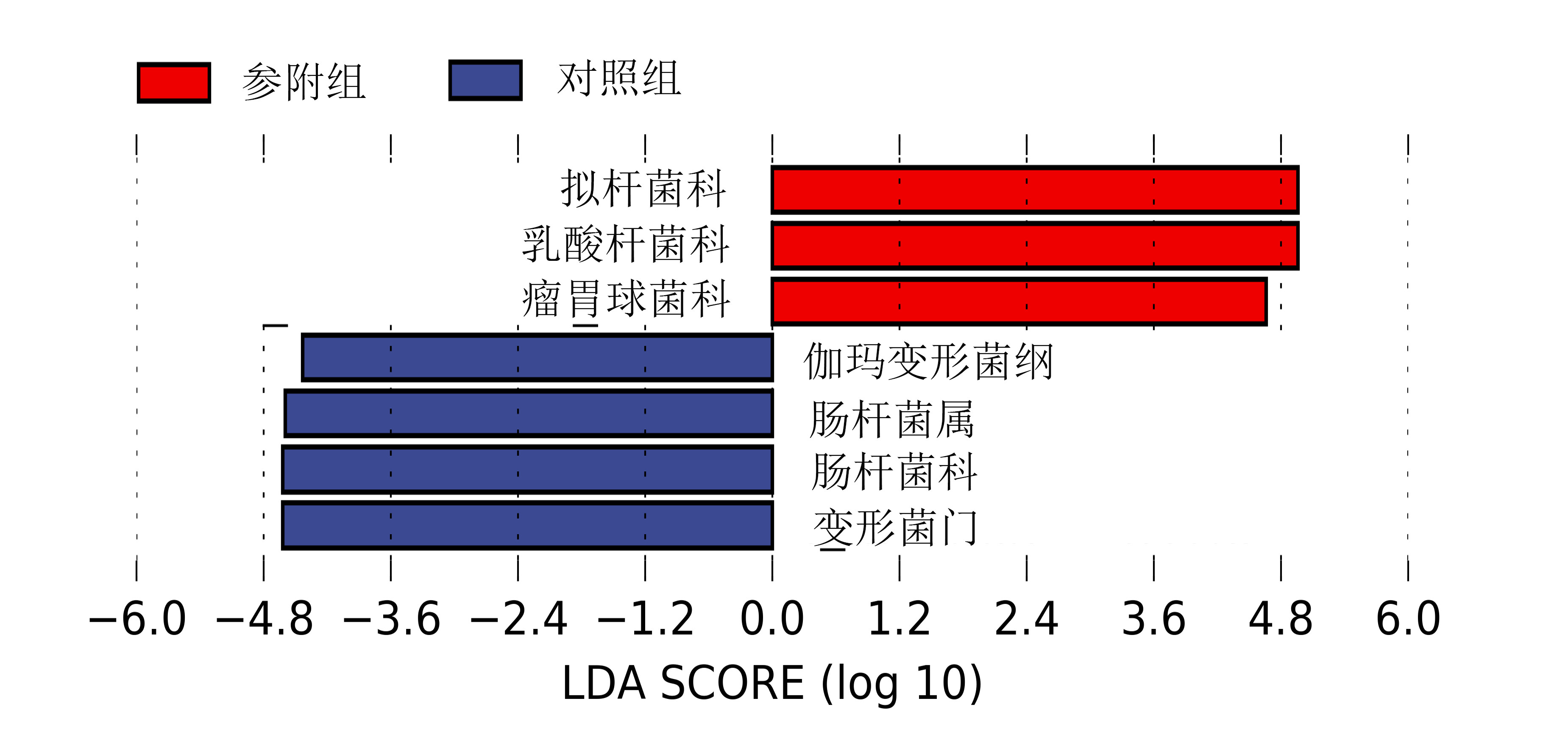 用LEfSe分析法分析各组间物种差异,参附组与对照组在肠道菌群组成上的显著差异菌群主要为拟杆菌科、乳酸杆菌科和瘤胃球菌科。见图 3。