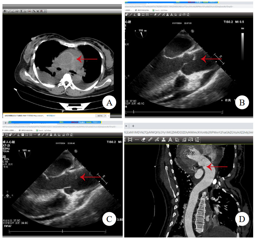 病例3,男,60岁,因“半小时前晕厥1次”就诊。送入抢救室时见患者大汗淋漓,显著呼吸困难,查体:心率97次/min,血压76/52 mmHg(1 mmHg=0.133 kPa),精神极软,颈静脉怒张,心音低钝,未及心脏杂音。立即查床边TTE,见大量心包积液(图 3A)。符合心包填塞,予心包穿刺,见血性液体流出约100 mL后,患者胸闷缓解,心率下降,血压138/88 mmHg。查主动脉CTA,见升弓交界靠上腔静脉侧LIT(图 3B,C,D),该处主动脉直径为31 mm,局部外膜薄层血肿形成。建议手术,患方拒绝,在抢救室留置6 h后生命体征突然消失,后宣布临床死亡。