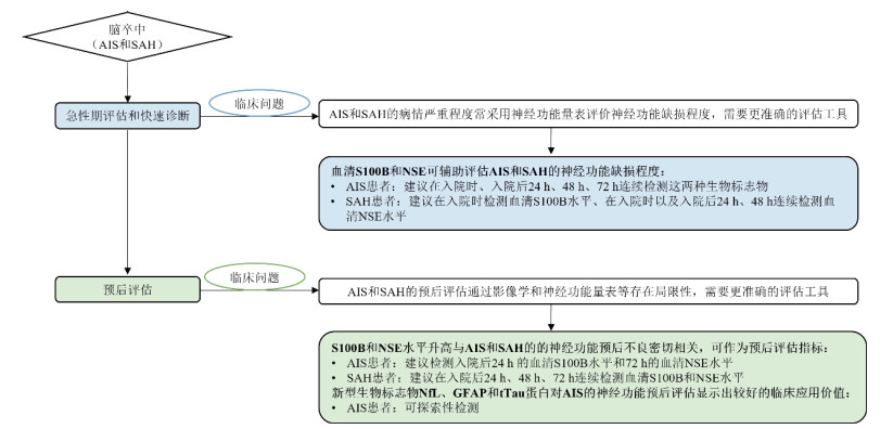 推荐意见10.1:S100B和NSE水平升高与AIS的神经功能预后不良密切相关,可作为AIS的预后评估指标,建议使用入院后24 h的血清S100B水平和72 h的血清NSE水平,并结合影像学检查和神经功能检查量表,用于综合评估患者的预后(证据级别:2;推荐级别:B)。