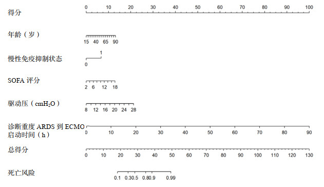 ARDS是一种严重的、弥漫性的肺实质炎性损伤,属于ICU内常见急危重症[1, 8]。ECMO作为重度ARDS患者的终极支持手段,其实际疗效及患者获益性往往难以准确评估。尽管已有若干预测模型辅助临床决策,但是由于地区、医疗条件差异以及ECMO技术管理仍在不断优化,现有的模型在实际应用中存在一定的局限性[23]。因此,为了进一步筛选能从ECMO治疗中获益的人群,通过分析患者临床资料及实验室指标,构建了一个以年龄、慢性免疫抑制状态、SOFA评分、ΔP、诊断重度ARDS到ECMO启动时间为预测因子的新型预测模型。