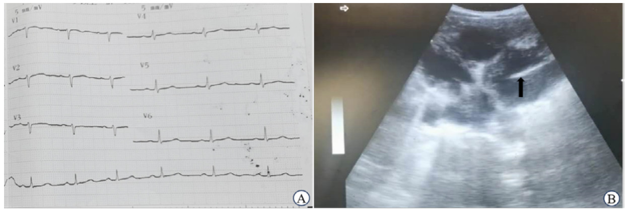 1.2 辅助检查患者实验室检查:白细胞计数7.4×109/L,空腹血糖5.9 mmol/L、血红蛋白95 g/L、血小板计数60×109/L、天门冬氨酸氨基转移酶73 U/L、丙氨酸氨基转移酶110 U/L、人体免疫缺陷病毒抗体阳性、梅毒快速血浆反应素试验阳性、乙肝表面抗原阳性,血吸虫抗体及疟疾抗原检测阴性,医院无法开展凝血功能检查。心电图未见明显心肌缺血性改变(图 1A);肝脏超声检查提示肝实质回声增强,可见弥漫分布的高回声结节,肝左叶可见一圆形无回声区,边界清除,提示肝硬化改变及肝囊肿;使用腹部超声探头于剑突下四腔心切面探查可见左心室内条状高回声,位置和形状固定,周围未探及大的血栓或赘生物影(图 1B)。