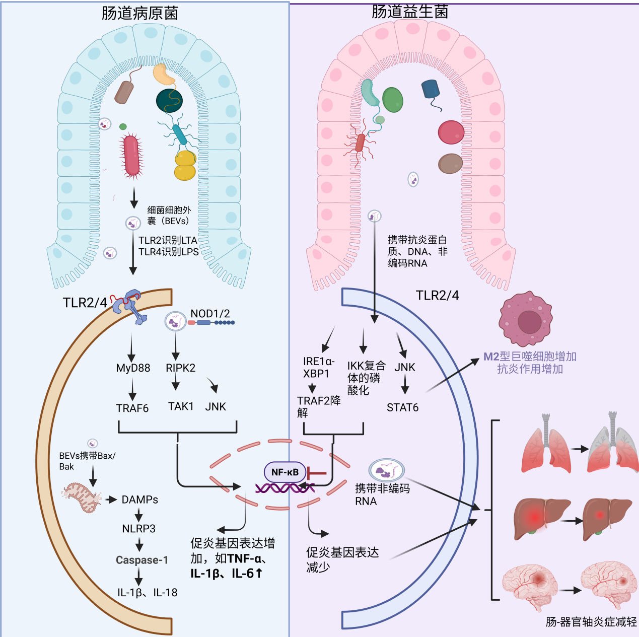 | 图 1 肠道病原菌与益生菌EVs在脓毒症中的作用对比 |