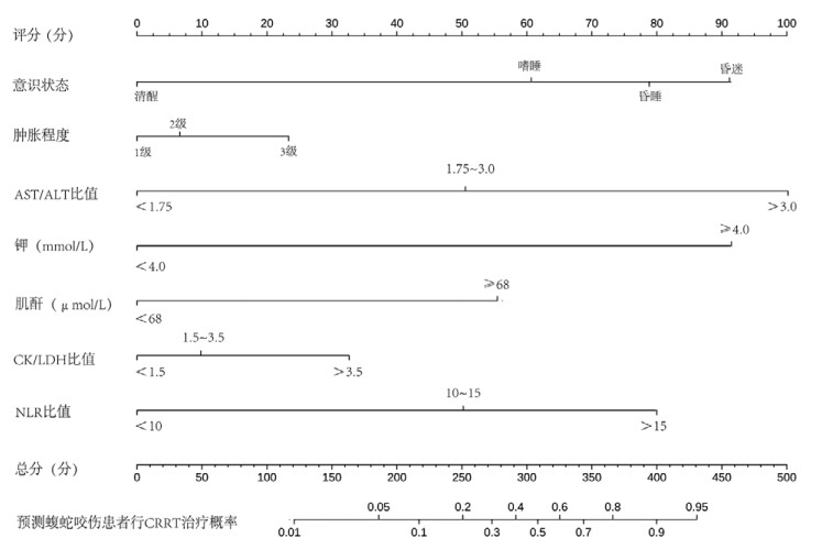 | 图 3 蝮蛇咬伤患者行CRRT治疗预测模型的列线图 Fig 3 Nomogram of the CRRT Prediction Model for Patients with Gloydius Bites |