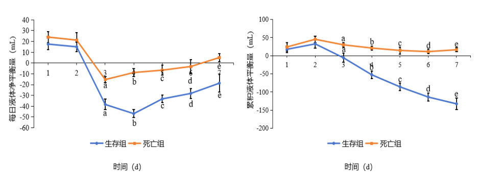 | 注:图A为每日液体净平衡量;图B为7 d累积液体平衡量;a、b、c、d、e表示时间点两组液体平衡差异具有统计学意义(P < 0.05)。 图 1 两组液体平衡量比较 Fig 1 Comparison of fluid balance between the two groups |