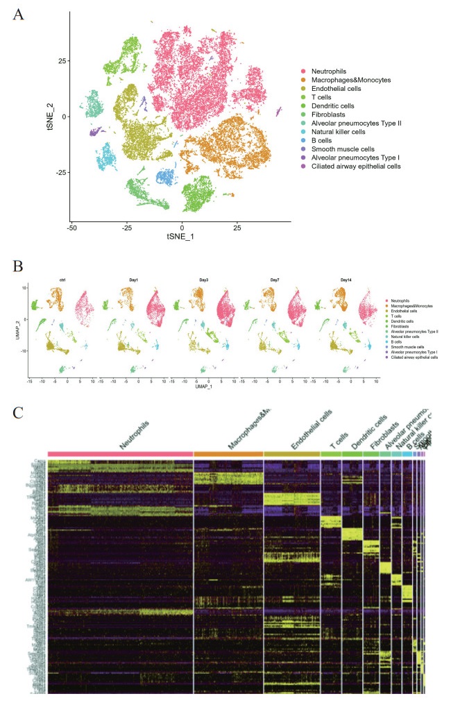 | 注:A为小鼠肺组织细胞组成;B为CLP后不同时间小鼠细胞组成动态变化;C为单细胞测序鉴定出的12个细胞簇的基因表达谱 图 1 脓毒症小鼠肺组织细胞组成分析与动态变化(n=3) Fig 1 Analysis of Cellular Composition and Dynamic Changes in Lung Tissues of Septic Mice(n=3) |