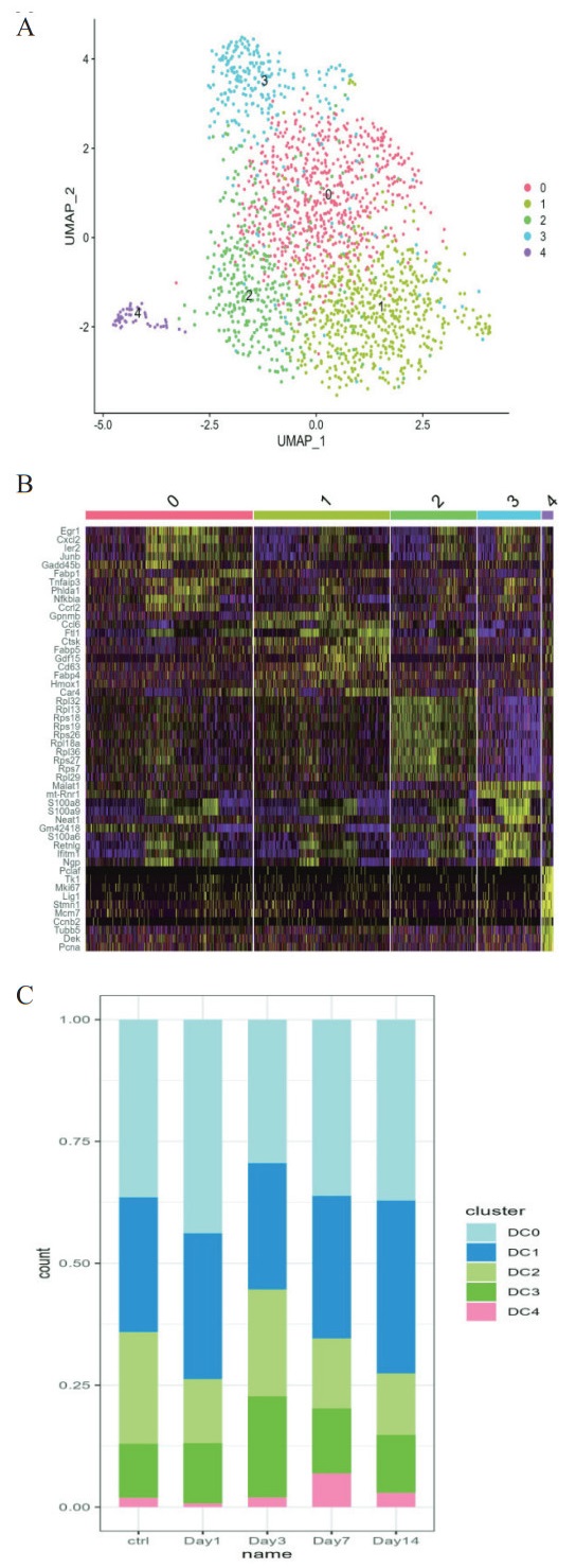树突状细胞(dendritic cell,DC)是固有免疫与获得性免疫的桥梁细胞。根据不同亚群表达谱不同,将树突状细胞分为DC0、DC1、DC2、DC3、DC4等5群细胞(图 5A)。DC0高表达Cxcl12、Fabp1等,DC1高表达CC了6、CD63等,DC2高表达Rpl13、Rps26等,DC3高表达S100A8、S100A9等,DC4高表达Mki67等,表明DC4可能为祖细胞(图 5B)。进一步分析结果显示DC0细胞在脓毒症后第1天增加,第3天后恢复正常(图 5C),DC3在第3天逐渐增加,第7天逐渐恢复正常(图 5C)。