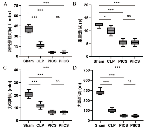 通过HE染色,观察了各组小鼠胫骨前肌的组织形态学变化。Sham组小鼠胫骨前肌肌纤维排列整齐、形态规则,CLP组、PICS组及PIICS组则可见肌纤维横截面积减小、间隙增宽,伴炎性细胞浸润,提示肌肉组织发生明显萎缩与炎症改变。
