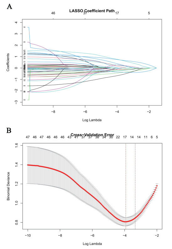 1.3 统计学方法本研究的统计分析均使用R语言(版本4.5.1)完成。计量资料经正态性检验后,符合正态分布者以均数±标准差(x±s)表示,组间比较采用两独立样本t检验;不符合者以中位数(四分位数间距)[M(Q1,Q3)]表示,组间比较采用Mann-Whitney U检验。计数资料以例数(百分比)[n(%)]表示,组间比较根据理论频数选择χ2检验或Fisher确切概率法。将数据按照7:3比例随机分为训练集325例和验证集139例。在训练集中,先采用LASSO回归分析筛选变量,依据λ.min与λ.1se准则分别保留变量。将筛选出的变量进一步纳入多因素Logistic回归,以确定独立预测因素,据此构建并绘制列线图预测模型。模型性能通过AUC评估区分度,校准度采用Hosmer-Lemeshow检验及校准曲线评估,并通过决策曲线分析评估临床实用性。此外,对12种传统评分进行单因素Logistic回归分析,筛选出有预测意义的评分,并与新建模型在区分度、校准度及临床实用性方面进行综合对比。以P < 0.05为差异有统计学意义。