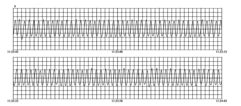 免疫治疗第60天,11:16患者因突发“心脏不适40 min ”拨打急救电话求助。救护车于11:20到达现场,经采集病史和初步评估后立即予以吸氧、建立静脉通道、第一时间全程心电监护,并启程转运。11:33途中患者突发意识丧失,颈动脉搏动消失,心电图示宽QRS心律(图 1),判定为无脉性室速(pulseless ventricular tachycardia, pVT)。急救医生立即给予360 J非同步电除颤一次,成功转复为窦性心动过速,心率150次/min(图 2),患者意识恢复,血压145/103 mmHg,11:38收入急诊抢救室。