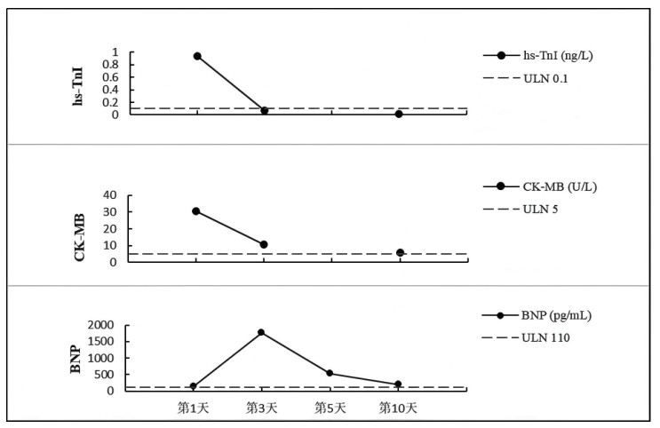 | 注:超敏肌钙蛋白Ⅰ与肌酸激酶同工酶于当日(电风暴发作日)显著升高后迅速回落,符合急性心肌损伤的典型演变过程。N末端B型利钠肽原在第3天出现峰值后持续下降,提示心肌损伤后伴随一过性的心功能不全或容量负荷加重,随后功能逐渐恢复。至第10日,三项指标均接近或降至正常参考上限附近,表明心肌损伤与心功能压力得到有效控制 图 5 关键心脏标志物的时序变化趋势 |