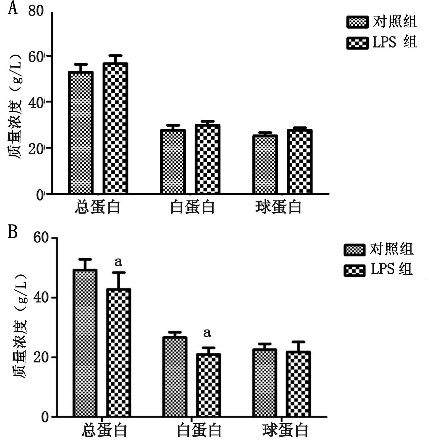 | A:注射LPS 6 h;B:注射LPS 24 h;与对照组比较,aP<0.05 图 1 注射LPS 6 h,24 h后血清总蛋白,白蛋白,球蛋白变化 |