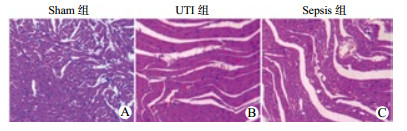 通过HE染色发现, Sepsis组可见灶性心肌纤维断裂、结构破坏、肌膜细胞增生且肌质溶解、细胞核部分消失、局部心肌坏死; 间质出现水肿及血管内淤血, 炎症细胞浸润; 心肌细胞可见嗜酸性变和空泡样变性。UTI组结构基本完整, 心肌纤维断裂减少, 血管充血, 渗出较轻, 心肌间质少量炎性细胞浸润, 病理损害较Sepsis组明显减轻, Sham组心肌结构大致正常(图 1)。