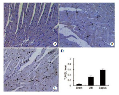 TUNEL检测心肌细胞凋亡, 正常细胞核呈淡蓝色, 形态较清晰、完整。凋亡阳性细胞核呈棕黄或棕褐色。在sham组心肌仅少数视野偶见个别凋亡细胞, 而在Sepsis组心肌细胞凋亡明显增加, UTI组较Sepsis组减少。通过凋亡指数计算, UTI组心肌细胞凋亡指数(32.2±4.8)%显著低于Sepsis组(58.4±5.6)%(P < 0.05), 见图 3。