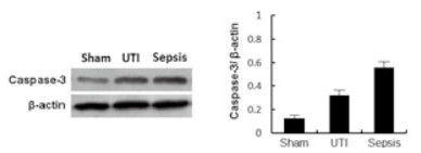 | Western blot法检测凋亡蛋白Caspase-3表达, UTI组与Sepsis组比较, P < 0.05 图 4 建模后36 h大鼠心肌组织中Caspase-3表达水平 Figure 4 Expression levels of Caspase-3 protein in myocardial tissue in rats 36 h after modeling |