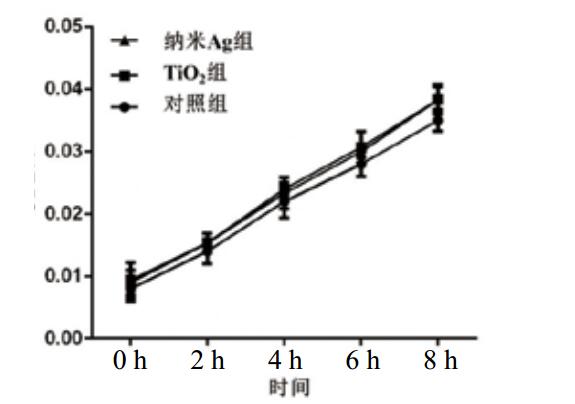 | 注:在相应时间点,纳米Ag组和TiO2组分别与对照组相比aP > 0.05。 | |||||