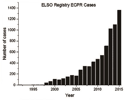 体外生命支持协会(Extracorporeal Life Support Organization, ELSO)长期登记其会员单位的体外生命支持(extracorporeal life support, ECLS)的病例报道信息。随着技术的进步,ECPR的实施越来越简便易行,病例数量也逐步增多。近20余年,每年登记在ELSO的ECPR病例数量呈现显著上升趋势,如图 1所示[5]。由于加入协会是自愿的,该报道显然未能涵盖全部ECPR病例数量。