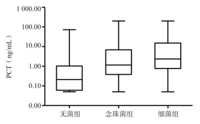 1.3 统计学方法应用SPSS 20.0软件进行统计分析,绘图采用软件GraphPad prism 5.0。正态分布计量资料用均数±标准差(x±s)表示,组间比较采用独立样本t检验,偏态分布计量资料用M(P25,P75)表示,两组间比较采用Mann-Whitney U检验,多组间比较采用Kruskal-wallis检验,并通过Whisker箱图显示各组PCT检测结果。PCT的截断值及诊断性能采用ROC曲线进行分析。通过单因素和多因素logistic回归分析计算念珠菌血流感染相关因素的OR值和95%CI。以P < 0.05为差异有统计学意义。
