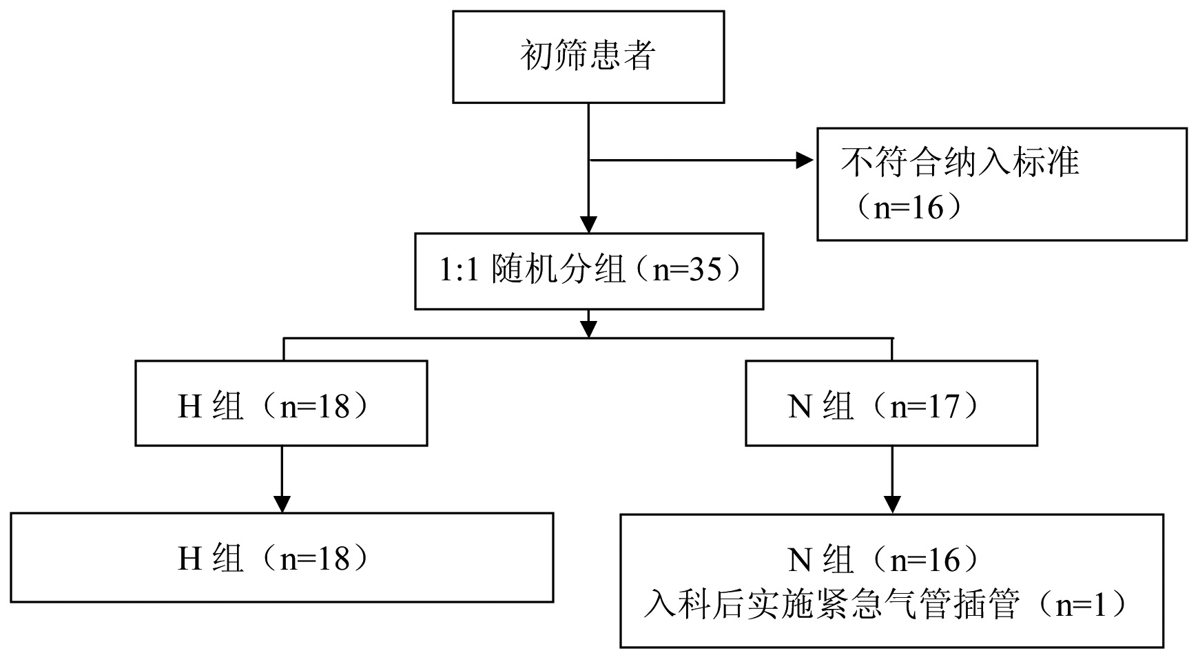 2 结果 2.1 基本情况比较本研究共观察患者51例,其中16例不符合纳入标准,其余35例患者采用计算机随机软件进行随机分组,最终纳入患者35例患者,H组纳入患者18例,N组纳入患者17例,N组中一例患者因入科后实施紧急气管插管而退出该试验。研究对象筛选流程见图 1。