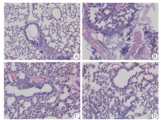 A:对照组;B:百草枯染毒组;C:GW3965低剂量组;D:GW3965高剂量组 图 1 各组小鼠肺组织病理学改变 Figure 1 Pathological changes of lung tissue in mice of each group |
