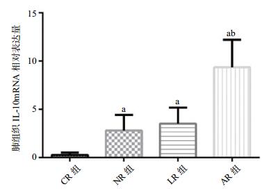 | 与CR组比较,aP < 0.01;与NR组、LR组比较,bP < 0.01 图 2 各组大鼠肺组织IL-10 mRNA相对表达量 Figure 2 Relative expression of IL-10 mRNA in lung tissue of rats in each group |