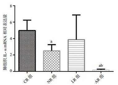 | 与CR组比较,aP < 0.01;与NR组、LR组比较,bP < 0.01 图 3 各组大鼠肺组织TNF-α mRNA相对表达量 Figure 3 Relative expression of TNF-α mRNA in lung tissue of rats in each group |