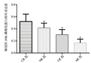 | 与CR组比较,aP < 0.01;与NR组、LR组比较,bP < 0.01 图 5 各组大鼠肺组织JNK磷酸化蛋白相对表达量 Figure 5 Relative expression of JNK phosphorylation protein in lung tissue of rats in each group |