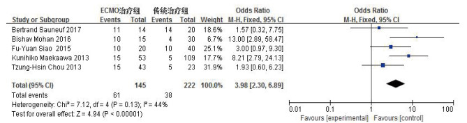 随访时间较长的研究有5项[6, 8, 11-13](有3项分别随访至3个月[6]、90 d[13]和6个月[12],2项随访至1年[8, 11]),各研究间同质性较好(P=0.13, I2=44%),利用固定效应模型进行Meta分析,结果显示,可认为ECMO能够改善非肺部原发性急诊危重症患者大于90 d生存率[42.1%(61/145)vs.17.1%(38/222),OR=3.98,95%CI:2.30~6.89, P < 0.01]。