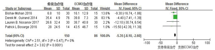 | ECMO为体外膜肺氧合,Mean为均数,SD为标准差,Total为总数,Study or Subgroup为研究或亚组,Weight为权重,Mean Difference为加权均数差,Fixed为固定效应模型 图 4 ECMO应用对非肺部原发性急诊危重症患者平均住院天数影响的Meta分析 Figure 4 Forest plot showing the fixed-effects model estimating the average length of hospital stay |