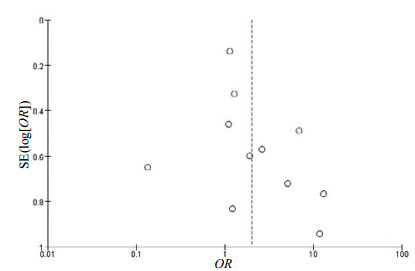 2.2.4 发表偏倚法分析11个研究大致均匀分布在垂线的两侧,推测纳入的11篇文献发表偏倚不大,见图 6。