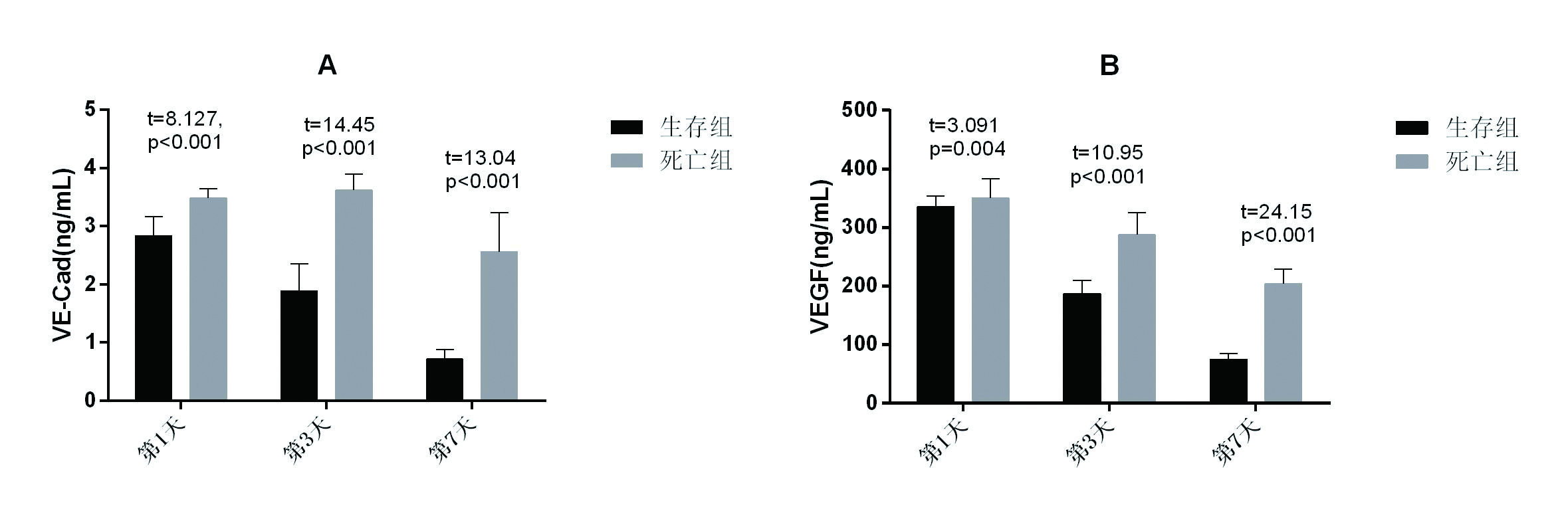 死亡组1、3和7 d的血清VE-Cad和VEGF水平均高于生存组(均P < 0.01);生存组血清VE-Cad和VEGF水平逐渐向正常水平回落(均P < 0.05),而死亡组血清VE-Cad和VEGF水平均维持在较高水平(P > 0.05)。见图 2。