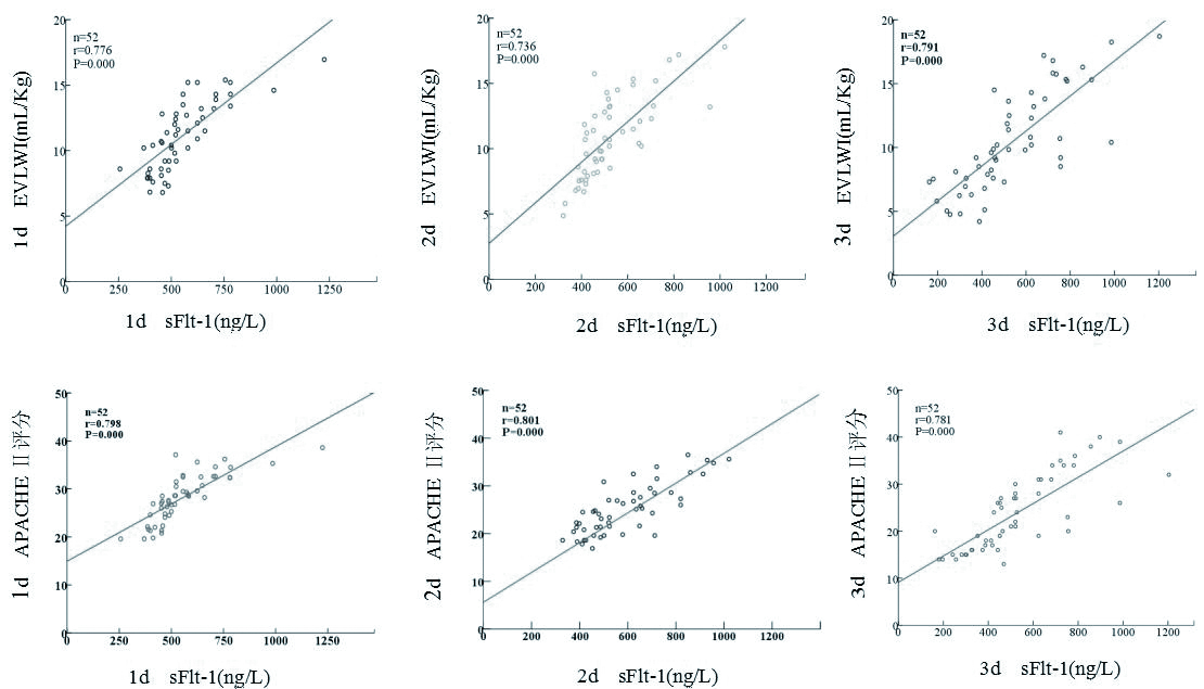 重症肺炎ARDS合并感染性休克患者在入住RICU治疗1、2、3 d时的sFlt-1水平分别与EVLWI及APACHEⅡ评分均显著相关(P均 < 0.01),见图 2。