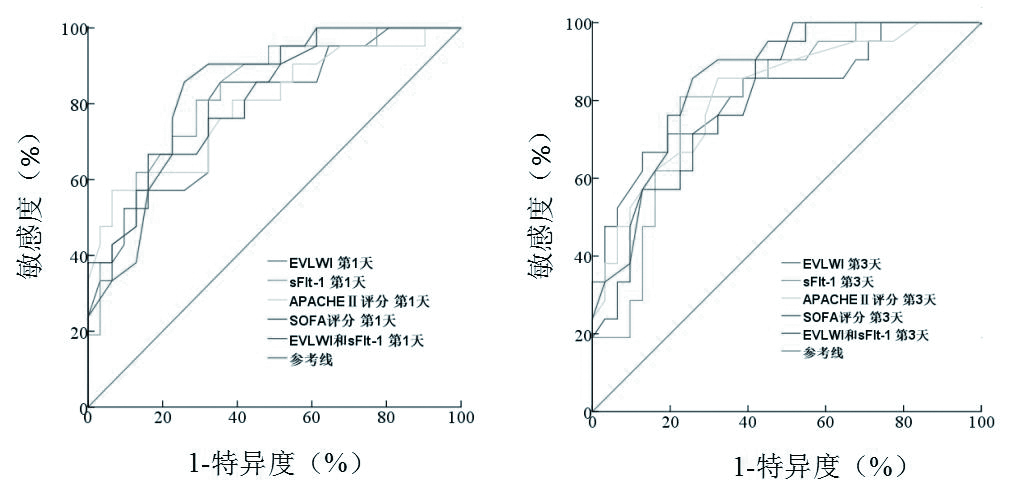 入住RICU第1、3天时,sFlt-1联合EVLWI预后评估的敏感度和特异度分别为89.7%,78.2%和86.3%,75.7%,AUC分别为0.875和0.856(P均 < 0.01),分别大于同期其他指标的AUC,见表 5和图 3。