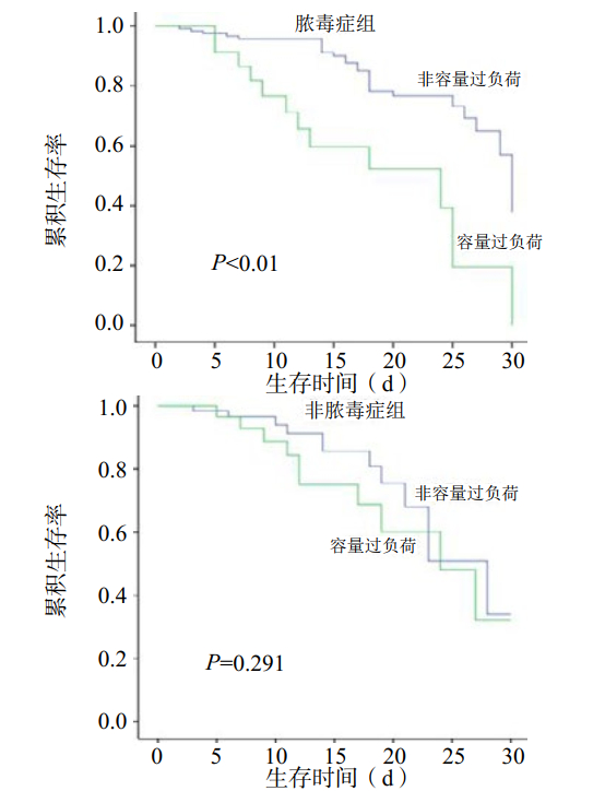 根据患者是否存在脓毒症将患者分为脓毒症组(n=154)和非脓毒症组(n=107)。脓毒症组容量过负荷(n=62)与非容量过负荷(n=92)患者30 d生存率差异有统计学意义(P < 0.01),非脓毒症组容量过负荷(n=31)与非容量过负荷(n=76)患者的30 d生存率差异无统计学意义(P=0.291),见图 3。