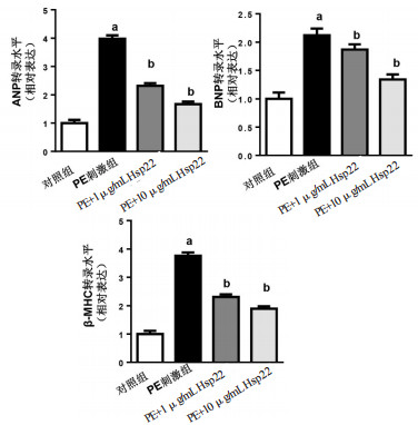 PE刺激心肌细胞48 h,同时给予两种浓度的Hsp22(1、10 μg/mL)处理。RT-PCR结果发现,PE刺激后心肌细胞肥厚相关基因心房利钠肽(ANP)(3.98±0.12 vs 1.00±0.13,t=44.84,P < 0.05)、B型利钠肽(BNP)(2.12±0.14 vs 1.00±0.17,t=16.85,P < 0.05),β肌球蛋白重链(β-MHC)(3.76±0.15 vs 1±0.12,t=41.53,P < 0.05)的转录水平明显升高。
