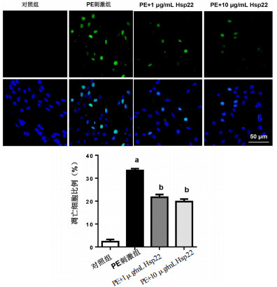 与PE刺激组相比,1和10μg/mL的Hsp22降低心肌细胞凋亡数量[(21.7±1.2)%和(19.8±1.6)%,t=20.02,P < 0.05;t=24.70,P < 0.05],见图 5。