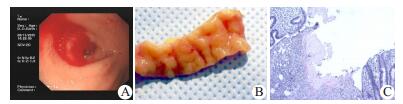 A:结肠镜见阑尾开口深处新鲜血波动性涌出;B:阑尾标本距断端约1.0 cm处黏膜见0.1 cm樱桃红色血栓;C:术后病理(HE×40)见局部溃疡,伴黏膜内血管破裂出血 图 1 患者结肠镜检查结果及标本病理检查 |