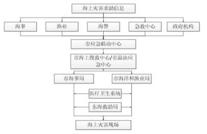 2.2 加快信息化建设如图 1显示,舟山市已组建社会应急联动救助平台,遇险人员将信息向主管部门上报(如渔民报告海洋和渔业局,或者村、镇领导,或110、急救指挥中心),再由接警的部门评估核实后,将相关信息传递给需要协助的部门(如海洋和渔业局需要卫生部门配合,联系急救指挥中心,后者通知相关医院委派医护人员由120救护车送至码头与海洋和渔业局救援船一同出海救援)。平台的建立提高了海上救援的效率。但报警信息在多次传递后造成信息失真,同时由于接警人员往往不是医务人员,缺少对患者伤情的医学评估,可能出现救助过度或不足的情况。另一方面,由于医务人员不能与伤员或者现场人员直接沟通,因此不能进行及时的医学指导[5]。因此,加快海上救援的信息化建设,提高救援效率刻不容缓。