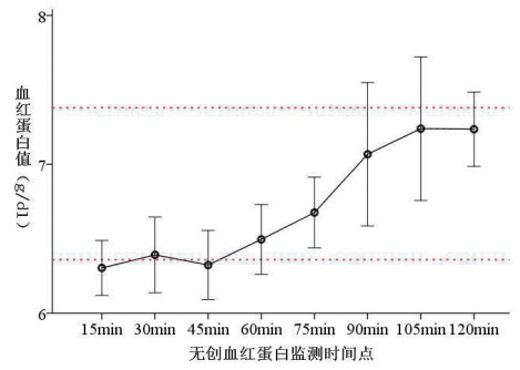 开始输血时患者无创监测的血红蛋白水平与常规法静脉抽血检测值(虚线A)相当(t=-0.627,P=0.537),输血过程中无创血红蛋白监测值逐步增加(重复测量方差分析:F=14.487,P < 0.01),至输血开始后的120 min时(平均输血结束30 min左右)测量值与抽血实验室化验值(虚线B)相当(t=-1.189,P=0.246)。经过重复测量方差分析,输血开始和输血结束后无创监测和常规法监测血红蛋白的差异无统计学意义(F=0.496,P=0.485),见图 1。